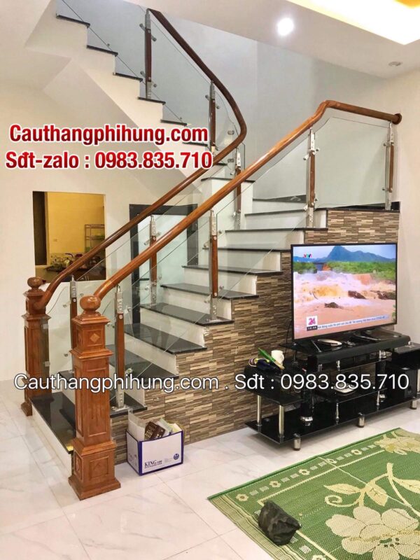 CẦU THANG LAN CAN KÍNH TAY VỊN GỖ